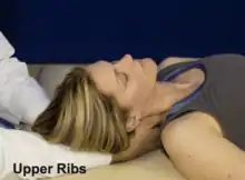 Exhalation dysfunction key ribs 3-5 (pectoralis minor) | Patient is supine. Ask the patient to place their dysfunction-side arm in abduction to 90 degrees. The elbow may be flexed to allow for better positioning. Contact the key rib as close the costotransverse junction as possible with one hand, and stabilize the patient’s elbow with the other hand. Ask the patient to perform a forced maximal inhalation and simultaneously try to lift their elbow straight off the table. Resist their elbow motion, and during the inha- lation phase apply a caudad force on the key rib at the costotransverse junction. | ![]() Ribs 3-5 exhalation dysfunction |