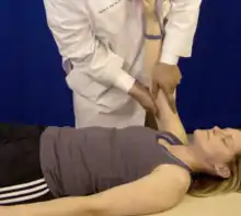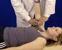 Presacral release | The patient in the supine position. The physician makes a C-shape with the thumb, index, and third fingers and presses downward in the lower abdominal region just above the ramus of the pubic bone. As with assessment of the thoracic outlet, compare motion in superior/inferior motion, left and right translation, and torsion (like a steering wheel), looking for fascial restrictions. Direct myofascial release is applied for 30 seconds and a release should be palpated; longer times may be required. | ![]() Pre-sacral Release |