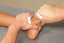 Plantar fascia release - medial longitudinal arch springing | The patient is supine. The physician places both thumbs under the longitudinal arch of the of the patient's foot. The physician's hands twist in opposite directions in a wringing motion. | ![]() Plantar Fascia Release - Medial Longitudinal Arch Springing |