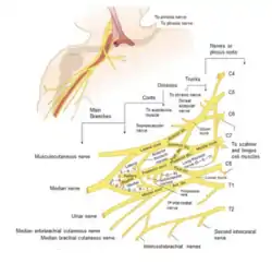 The six divisions that terminate from the brachial plexus are the musculocutaneous nerve, the axillary nerve, the radial nerve, the median nerve, the ulnar nerve, and the thoracodorsal nerve. Moving distally, the lateral cord forms the musculocutaneous nerve and, together with the medial cord, forms the median nerve. The posterior cord nerve branches will form the axillary nerve, the radial nerve, the thoracodorsal nerve, and the subscapular nerve. The medial cord also gives rise to the ulnar nerve.