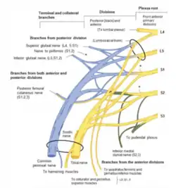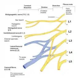 The lumbar plexus is a nervous plexus in the lumbar spine which forms part of the lumbosacral plexus. As with the brachial plexus in the upper extremity, the spinal nerves contributing to the lumbar plexus have both anterior divisions and posterior divisions (anterior divisions are shaded yellow and posterior divisions is shaded blue in the figure above).