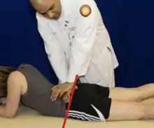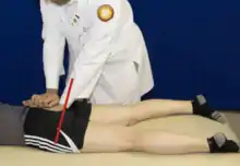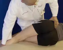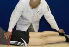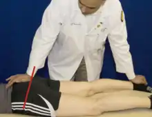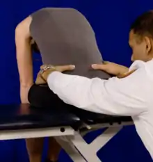 The seated flexion test is performed to also determine laterality of sacroiliac dysfunction. It is done by having the patient seated on the exam table with the knees flexed to 90 degrees. The physician sits behind the patient with the eyes at the level of the pelvis and the thumbs on the PSIS. The patient is asked to bend forward. Ideally, the patient’s feet should be in contact with the ground while performing this test to avoid injury to the patient. As with the standing flexion test, the side that moves first and moves the furthest is the positive side, indicating sacroiliac restriction on the ipsilateral side. | ![]() Seated flexion test |