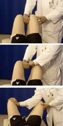 Gapped Pubic Symphysis (utilizes hip abductors): Patient is supine, with knees bent and knees apart. The physician places their hands on the lateral aspect of each of the patient’s knees. The physician asks the patient to push out into their hands and at the same time the operator resists this motion resulting in no movement of the legs. For the second and third iterations, the physician brings the knees closer together. | ![]() Gapped Pubic Symphysis ME |