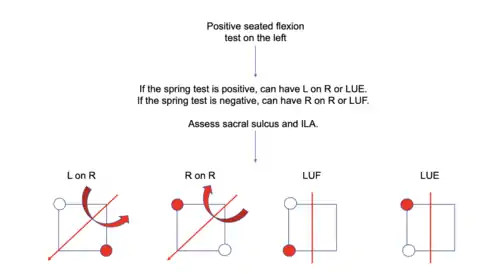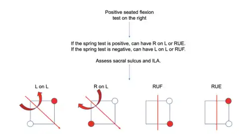 Sacral somatic dysfunction | Positive seated flexion side | Spring test | Sacral sulcus deep | ILA shallow | Visual representation |