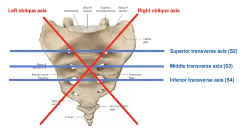 Sacrum nomenclature is always named with the sacral promontory as a point of reference. Torsional axes are always named by the SI joint involved. Torsion dysfunctions are named by rotation on axis. For example, a right on left sacral somatic dysfunction means that a rightward rotation is occurring about a left oblique axis.
