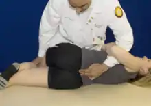 Bilateral Flexion Shear: Place the patient in the prone position on the table. Abduct and internally rotate both lower extremities until the ilia are as laterally displaced as possible with respect to the sacrum. Contact the inferior lateral angles of the sacrum. Instruct the patient to perform 3 long, slow cycles of inhalation and exhalation. During the patient’s inhalation phase, apply firm downward pressure onto the inferior lateral angles. During the patient’s exhalation phase, actively resist sacral nutation. | ![]() Bilateral Flexion Shear ME |