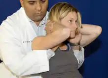 Seated HVLA (Full Nelson): The patient is seated on the table, while the physician stands behind the patient. The patient is instructed to interlock their hands behind her head. The physician weaves their arms from anterior to posterior through the opening created by the patient’s arms, and interlocks their hands on top of the patient’s hands. The patient is instructed to bring their elbows together and relax and look up toward the ceiling. The physician then brings the dysfunctional transverse process or apex of a group dysfunction into contact with the physician’s sternum. The physician instructs the patient to take a deep breath in and out. At the end of exhalation with the physician’s knees bent, the physician exerts a quick but gentle thrust superiorly and posteriorly from their legs. | ![]() Full Nelson |