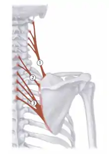 Levator scapulae | C1-C4 transverse processes | Superior angle of the scapula | Medial and upward movement of scapula | Dorsal scapular nerve (C4-C5) | ![]() 1 - levator scapulae |
