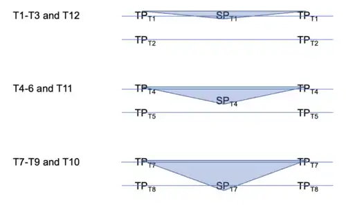 - T4-T6, T11: spinous process is located ½ segment below corresponding transverse process