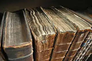 The Gutenberg Bible, one of the first printed books | Old books in a library. |