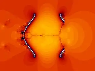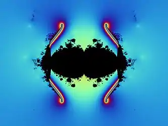 - Mandelbrot set constructed using two different critical points; shows boundary in the upper half part and continuous colouring