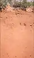 B Horizon- The B horizon is characterized by a red color, which stems from the process of oxidation, particularly of iron bearing minerals. As water moves through the soil, it transports dissolved ions into the deeper horizons. The B horizon is where iron minerals will oxidize with the oxygen-rich water, resulting in the deposition of red-colored rust, including minerals of hematite and limonite. Some of this oxidation might be mediated by bacteria. The B horizon is also affected by bioturbation, with roots of some plants extending into this layer of the soil, although less so than the above A horizon. The unique red color makes identification of the B horizon fairly easy in a dug hole, as it often stands out. Interestingly the B horizon tends to preserve subsequent soil deposition, as paleosol (fossilized soils) tend to lack the A horizon, but are often stacked B and C horizons, alternating between red colored sediments (B-Horizon) and the lower white colored sediments (C-Horizon).