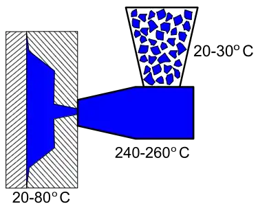 As seen from the picture below, the plastic polypropylene undergoes different temperature changes when it is in different parts of machine In hopper feeder, the plastic is at 20–30 °C , then in the injection machine which are at high temperature of 240–260 °C. Finally the plastics cools down to 20–80 °C.