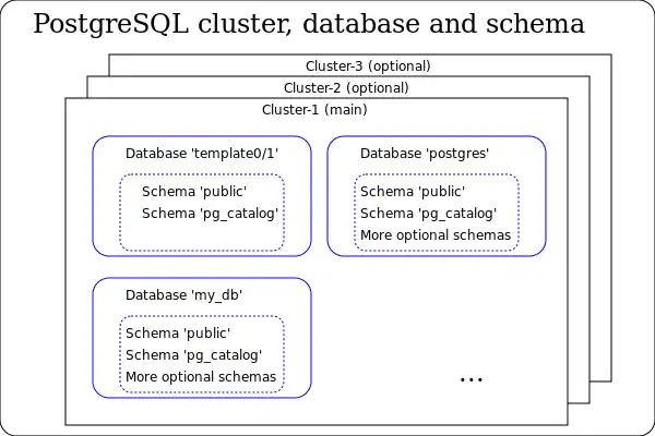 The storage area for one database is organized as one subdirectory tree within the storage area of the database cluster. Thus a database cluster may contain multiple databases.