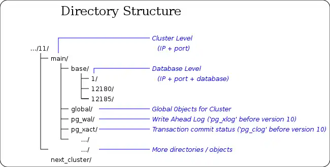 A cluster and its databases consists of files, which hold data, actual status information, modification information and a lot more. Those files are organized in a fixed way under one directory node.