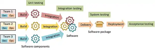 In DevOps, software components built by distinct DevOps teams are tested in isolation (unit testing). They are then assembled to create a single software (integration). Afterwards, the software is tested (integration testing) and put into a form—often called a package—that facilitates its distribution (delivery). Next, the package is tested (system testing) and installed into the production environment (deployment) to be tested one last time (acceptance testing). DevOps prescribes that operators should assist developers in order to automate entirely these stages. When done, continuous integration, continuous delivery, continuous deployment, and continuous testing are respectively achieved.
