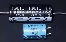 Electrolytic capacitors have very large capacitance per volume unit, which makes them good for capacitances over 1μF. They take the form of cylinders which range form a few millimetres in height to several hundred. There are two main types of packaging: axial and radial. Axial capacitors are generally rarer than radial capacitors and have a lead on each end of the cylinder. Radial capacitors have both leads on the same end.