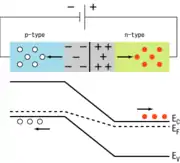 As seen in the images below: If the positive terminal of the power source is connected to the p-type semiconductor and the negative terminal of the power source is connected to the n-type semiconductor, the electron flows across the junction from n-type material to p-type material, and the holes flow in reverse. This will cause the junction area to become narrower allow easy movement of both holes and electrons.