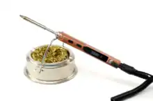 Soldering is the use of a conductive substance with a low melting point (solder) to electrically connect components together. It is frequently used to join wires to leads of components such as switches or to join components of all kinds to a printed circuit board. The primary tool used for applying solder is a soldering iron, a device whose metal tip heats to temperatures well above the melting point of solder. This is used to melt the solder and allow it to flow into a joint.