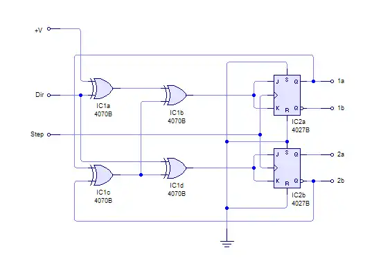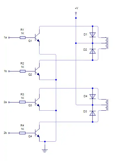 The sequence of voltages applied to connectors 1a, 1b, 2a and 2b is the same as before, so the system of XOR gates and JK flip-flops (or PIC, etc) can be used for unipolar motors. The transistor driver circuit is simpler, however: