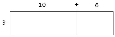 Because 16 = 10 + 6, students can visualize that the length of the above rectangle is still 16. They then can see that the larger rectangle can be expressed as the sum of the two smaller area rectangles: (3 x 10) + (3 x 6).