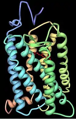 Opsins are a group of light-sensitive 35-55 kDa membrane-bound G protein-coupled receptors of the retinylidene protein family found in photoreceptor cells of the retina. Five classical groups of opsins are involved in vision, mediating the conversion of a photon of light into an electrochemical signal, the first step in the visual transduction cascade. Another opsin found in the mammalian retina, melanopsin, is involved in circadian rhythms and pupillary reflex but not in image-forming.