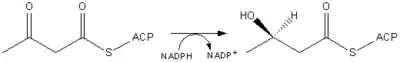 Reduction of acetoacetyl ACP | In this step, acetoacetyl ACP is reduced by NADPH into D-3-Hydroxybutyryl hydroxylase ACP2. The double bond is reduced to a hydroxyl group. Only the D isomer is formed. | ![]() | β-Ketoacyl-ACP Reductase |