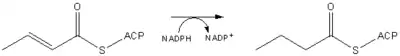 Reduction of crotonyl ACP | During this final step, crotonyl ACP is reduced by NADPH into butyryl ACP. | ![]() | Enoyl ACP reductase |