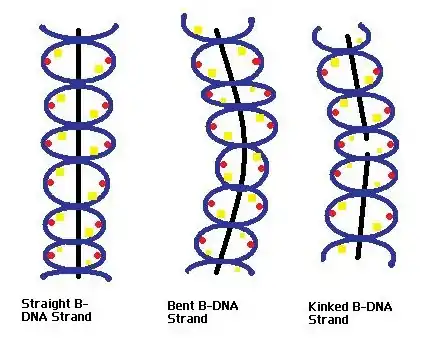 Kinks in the DNA strand are stabilized through a process called intercalation in which the DNA strand will become deformed in order to make contact between its phosphate groups. Sometimes there is complete intercalation in which the DNA shape is changed to allow for phosphordiester bonds. However, there is another type of intercalation in which the DNA strand behaves as a binding site. In this case, a protein can bind to the site of the kink and either preserve or further deform the overall shape of the DNA.”