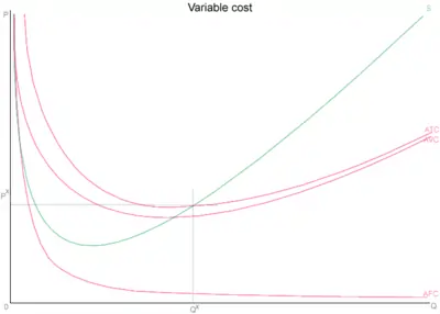 The green curve is the marginal cost, the cost of producing an additional unit of a good and includes only variable cost (no fixed cost). This curve starts very high but rapidly falls through increasing returns to scale (increasing productivity), then starts rising as resources become more scarce and costly and/or less suitable. The pink average variable cost curve trails the marginal cost, rising when marginal cost is higher than the average and falling when marginal cost is lower. The average variable cost is flat at the point when it is the same as the marginal cost.