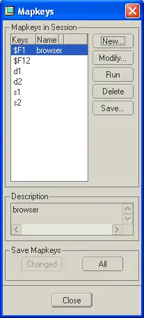 Start by choosing Tools > Mapkeys from the main menu. The Mapkeys dialog appears. The dialog shows a list of existing mapkeys: