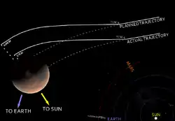 When Mars Climate Orbiter arrived at Mars on 23 September 1999, mission control expected to lose contact at 09:06 UTC as the craft passed behind Mars. Contact was lost two minutes earlier, indicating that its trajectory was different than planned. Mars Climate Orbiter did not exit the Martian shadow as expected at 09:27 UTC, and contact with the orbiter was never reestablished[2]. NASA declared the mission a loss the next day and launched an investigation.[3]
