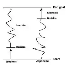 In western culture, businessmen often use their expertise to make a decision and then work out issues as they arise in execution. However, in Japanese culture businessmen focus on figuring out all details of a plan before making a decision, including factoring in input from individuals. This results in a smooth execution phase. Anyone choosing to go against the decision in its execution stage is perceived as ridiculous .
