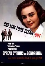 In WWI, medical records indicate that the U.S. Army "lost nearly 7 million person-days and discharged more than 10,000 men because of STDs."[1] This trend continued into WWII where the rate of syphilis among U.S. Army recruits was 4.5 out of every 100 men until 1942.[2]. In order to mitigate this problem, the War Department launched a "massive" ad campaign to warn soldiers and sailors about "excessively amorous behavior." [1]