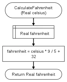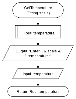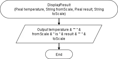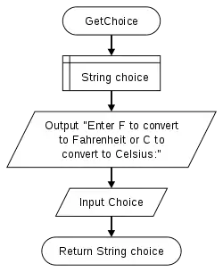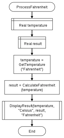 Function Main Declare String choice Assign choice = GetChoice() If Choice = "C" Or Choice = "c" Call ProcessCelsius() False: If Choice = "F" Or Choice = "f" Call ProcessFahrenheit() False: Output "You must enter C to convert to Celsius or F to convert to Fahrenheit!" End End End Function CalculateCelsius (Real fahrenheit) Declare Real celsius Assign celsius = (fahrenheit - 32) * 5 / 9 Return Real celsius Function CalculateFahrenheit (Real celsius) Declare Real fahrenheit Assign fahrenheit = celsius * 9 / 5 + 32 Return Real fahrenheit Function DisplayResult (Real temperature, String fromScale, Real result, String toScale) Output temperature & "° " & fromScale & " is " & result & "° " & toScale End Function GetChoice Declare String choice Output "Enter F to convert to Fahrenheit or C to convert to Celsius:" Input Choice Return String choice Function GetTemperature (String scale) Declare Real temperature Output "Enter " & scale & " temperature:" Input temperature Return Real temperature Function ProcessCelsius Declare Real temperature Declare Real result Assign temperature = GetTemperature("Celsius") Assign result = CalculateCelsius(temperature) Call DisplayResult(temperature, "Fahrenheit", result, "Celsius") End Function ProcessFahrenheit Declare Real temperature Declare Real result Assign temperature = GetTemperature("Fahrenheit") Assign result = CalculateFahrenheit(temperature) Call DisplayResult(temperature, "Celsius", result, "Fahrenheit") End