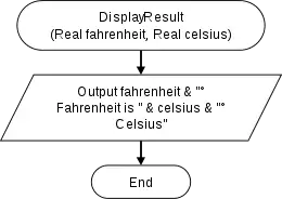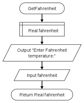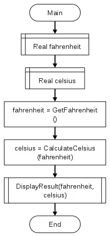 Function Main ... This program asks the user for a Fahrenheit temperature, ... converts the given temperature to Celsius, ... and displays the results. Declare Real fahrenheit Declare Real celsius Assign fahrenheit = GetFahrenheit() Assign celsius = CalculateCelsius(fahrenheit) Call DisplayResult(fahrenheit, celsius) End Function GetFahrenheit Declare Real fahrenheit Output "Enter Fahrenheit temperature:" Input fahrenheit Return Real fahrenheit Function CalculateCelsius (Real fahrenheit) Declare Real celsius Assign celsius = (fahrenheit - 32) * 5 / 9 Return Real celsius Function DisplayResult (Real fahrenheit, Real celsius) Output fahrenheit & "° Fahrenheit is " & celsius & "° Celsius" End