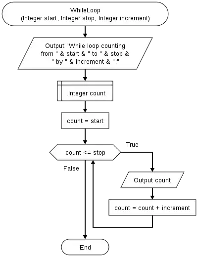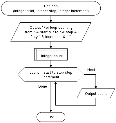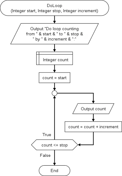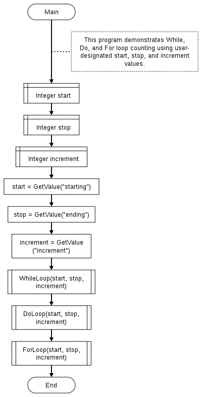 ... This program demonstrates While, Do, and For loop counting using user-designated start, stop, and increment values. Function Main Declare Integer start Declare Integer stop Declare Integer increment Assign start = GetValue("starting") Assign stop = GetValue("ending") Assign increment = GetValue("increment") Call WhileLoop(start, stop, increment) Call DoLoop(start, stop, increment) Call ForLoop(start, stop, increment) End Function GetValue (String name) Declare Integer value Output "Enter " & name & " value:" Input value Return Integer value Function WhileLoop (Integer start, Integer stop, Integer increment) Output "While loop counting from " & start & " to " & stop & " by " & increment & ":" Declare Integer count Assign count = start While count <= stop Output count Assign count = count + increment End End Function DoLoop (Integer start, Integer stop, Integer increment) Output "Do loop counting from " & start & " to " & stop & " by " & increment & ":" Declare Integer count Assign count = start Loop Output count Assign count = count + increment Do count <= stop End Function ForLoop (Integer start, Integer stop, Integer increment) Output "For loop counting from " & start & " to " & stop & " by " & increment & ":" Declare Integer count For count = start to stop step increment Output count End End