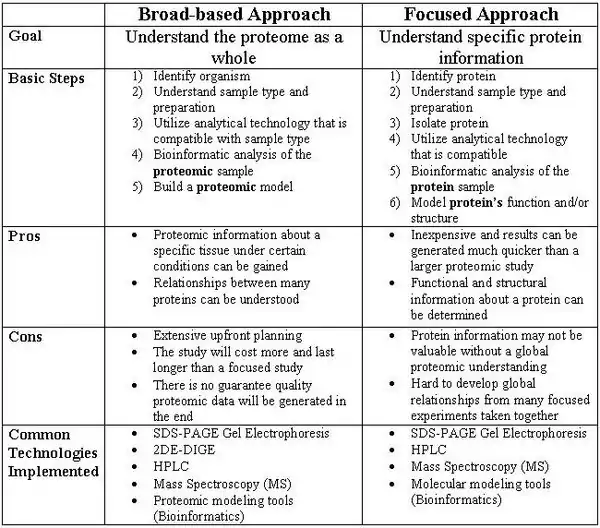 Proteomics as a field is becoming a very daunting one to enter because many studies are getting lost in the complicated focused details. To help assist with this challenge, a researcher can employ broad-based proteomics. Broad-based proteomics is a strategy where careful planning is employed upfront to answer a question about a proteome (for instance, comparisons between a tissue in a diseased state and a normal state) using the most appropriate and applicable technologies available. By developing a strategy at the beginning of a proteomics study, possible setbacks during the study are avoided.