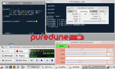 - What will happen is that the text editor will launch, as well as a window for supercollider output (in vim it's a separate window, in emacs it's the lower pane of the main window), and also a graphical interface to start/stop the audio server.