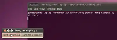 If you run the program above from a terminal, you should see a window with two buttons. Pressing the first button causes 'Hi there!' to be printed on the terminal. If you press the second button, the callback function hangs for five seconds, meaning that by pressing the second button and then the first in quick succession, the 'Hi there!' message won't be printed until 5 seconds has passed, demonstrating how signals are added to the queue which are executed one at a time.