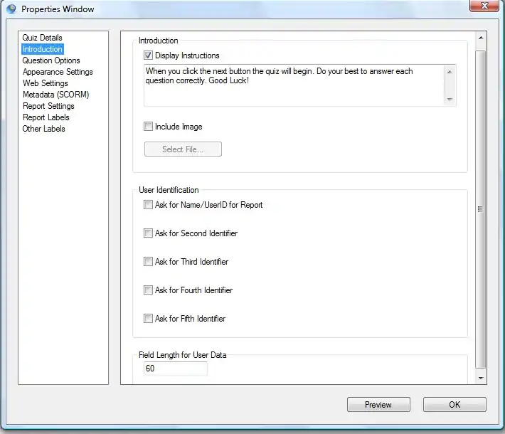 User IdentificationWith the Professional version, tick boxes allow you to set and collect up to 5 different identifiers for your quiz takers, eg Name, ID number, Email address, Company, Location. You can change the information that you collect by changing the name of each identifier in Other Labels. These identifiers will appear in the results reports. Field Length for User DataThe Professional version also allows you to input the field length for the user identification fields. You can enter anything you feel appropriate - but remember that space on a web page is limited. |