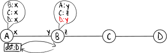 - DV: each of the DVs has destinations (Bellman-Ford: ).