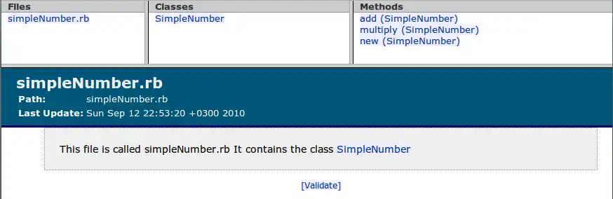 >> rdoc simpleNumber.rb simpleNumber.rb: c... Generating HTML... Files: 1 Classes: 1 Modules: 0 Methods: 3 Elapsed: 0.426s