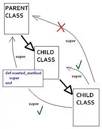 If you have a deep inheritance line, and still want to access some parent class (superclass) methods directly, you can't. super only gets you a direct parent's method. But there is a workaround! When inheriting from a class, you can alias parent class method to a different name. Then you can access methods by alias.