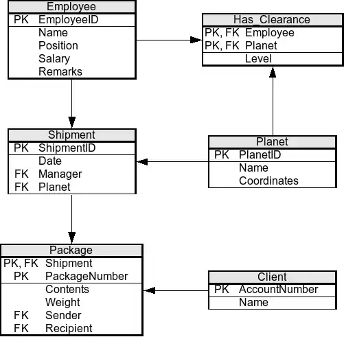 INSERT INTO Client VALUES(1, 'Zapp Brannigan'); INSERT INTO Client VALUES(2, "Al Gore's Head"); INSERT INTO Client VALUES(3, 'Barbados Slim'); INSERT INTO Client VALUES(4, 'Ogden Wernstrom'); INSERT INTO Client VALUES(5, 'Leo Wong'); INSERT INTO Client VALUES(6, 'Lrrr'); INSERT INTO Client VALUES(7, 'John Zoidberg'); INSERT INTO Client VALUES(8, 'John Zoidfarb'); INSERT INTO Client VALUES(9, 'Morbo'); INSERT INTO Client VALUES(10, 'Judge John Whitey'); INSERT INTO Client VALUES(11, 'Calculon'); INSERT INTO Employee VALUES(1, 'Phillip J. Fry', 'Delivery boy', 7500.0, 'Not to be confused with the Philip J. Fry from Hovering Squid World 97a'); INSERT INTO Employee VALUES(2, 'Turanga Leela', 'Captain', 10000.0, NULL); INSERT INTO Employee VALUES(3, 'Bender Bending Rodriguez', 'Robot', 7500.0, NULL); INSERT INTO Employee VALUES(4, 'Hubert J. Farnsworth', 'CEO', 20000.0, NULL); INSERT INTO Employee VALUES(5, 'John A. Zoidberg', 'Physician', 25.0, NULL); INSERT INTO Employee VALUES(6, 'Amy Wong', 'Intern', 5000.0, NULL); INSERT INTO Employee VALUES(7, 'Hermes Conrad', 'Bureaucrat', 10000.0, NULL); INSERT INTO Employee VALUES(8, 'Scruffy Scruffington', 'Janitor', 5000.0, NULL); INSERT INTO Planet VALUES(1, 'Omicron Persei 8', 89475345.3545); INSERT INTO Planet VALUES(2, 'Decapod X', 65498463216.3466); INSERT INTO Planet VALUES(3, 'Mars', 32435021.65468); INSERT INTO Planet VALUES(4, 'Omega III', 98432121.5464); INSERT INTO Planet VALUES(5, 'Tarantulon VI', 849842198.354654); INSERT INTO Planet VALUES(6, 'Cannibalon', 654321987.21654); INSERT INTO Planet VALUES(7, 'DogDoo VII', 65498721354.688); INSERT INTO Planet VALUES(8, 'Nintenduu 64', 6543219894.1654); INSERT INTO Planet VALUES(9, 'Amazonia', 65432135979.6547); INSERT INTO Has_Clearance VALUES(1, 1, 2); INSERT INTO Has_Clearance VALUES(1, 2, 3); INSERT INTO Has_Clearance VALUES(2, 3, 2); INSERT INTO Has_Clearance VALUES(2, 4, 4); INSERT INTO Has_Clearance VALUES(3, 5, 2); INSERT INTO Has_Clearance VALUES(3, 6, 4); INSERT INTO Has_Clearance VALUES(4, 7, 1); INSERT INTO Shipment VALUES(1, '3004/05/11', 1, 1); INSERT INTO Shipment VALUES(2, '3004/05/11', 1, 2); INSERT INTO Shipment VALUES(3, NULL, 2, 3); INSERT INTO Shipment VALUES(4, NULL, 2, 4); INSERT INTO Shipment VALUES(5, NULL, 7, 5); INSERT INTO Package VALUES(1, 1, 'Undeclared', 1.5, 1, 2); INSERT INTO Package VALUES(2, 1, 'Undeclared', 10.0, 2, 3); INSERT INTO Package VALUES(2, 2, 'A bucket of krill', 2.0, 8, 7); INSERT INTO Package VALUES(3, 1, 'Undeclared', 15.0, 3, 4); INSERT INTO Package VALUES(3, 2, 'Undeclared', 3.0, 5, 1); INSERT INTO Package VALUES(3, 3, 'Undeclared', 7.0, 2, 3); INSERT INTO Package VALUES(4, 1, 'Undeclared', 5.0, 4, 5); INSERT INTO Package VALUES(4, 2, 'Undeclared', 27.0, 1, 2); INSERT INTO Package VALUES(5, 1, 'Undeclared', 100.0, 5, 1);