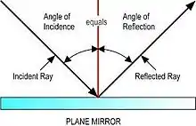 Reflection is energy waves bouncing off the surface of an object. Reflected light always leaves the reflecting surface at the same angle as it strikes the surface. Angle of incidence = angle of reflection. For example, you can picture a ball bouncing. If one drops a ball straight down it will bounce straight back up. If you bounce it at an angle it will bounce up in a angle. In a elementary school you might see this come in effect during their play time as boys and girls bounce balls.