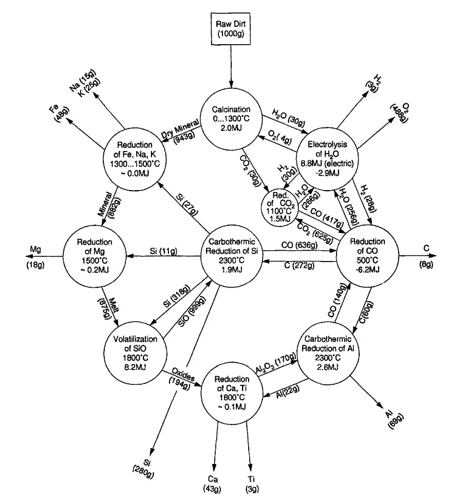 - Chemical Processing - The individual process elements listed above can make relatively simple chemical changes to the raw materials. To perform more complex conversions, chemical processes that link multiple elements will be needed. The following diagrams are two examples of complete chemical process flows, starting from raw materials and finishing with purified metals. They are not likely to be the final processes we will choose for our design, but illustrate the ideas of an integrated flow, and how such processes are made up of relatively simple steps. The steps are called Unit Operations in chemical engineering, which cannot be broken down further into simpler operations. Any number of such unit operations linked together make up a Process. We have as a goal to permit flexible operations to make a wide variety of products as needed. Thus rather than link the operations permanently, as is normally done in a commercial plant, we would consider them as modules that can be rearranged as needed.