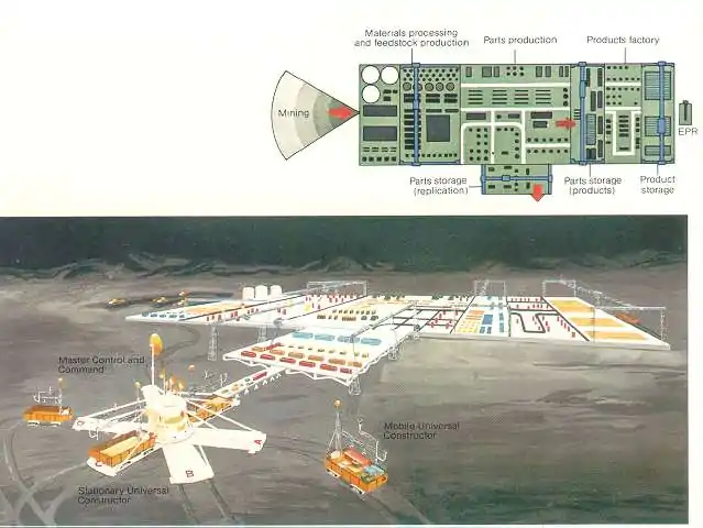 A 1982 NASA report, Advanced Automation for Space Missions (AASM), introduced the concept of a replicating factory for use on the Moon (Figure 2.1). Their approach was to copy the original factory hardware multiple times, using local materials and energy. Once enough copies had been made, the combined production capacity would turn to making an unspecified end product to support NASA goals. The AASM study introduced the term Seed Factory to mean the first unit of the factory delivered from Earth to the Moon. In these books we use it for the more general concept of a starter set which can expand by multiple methods besides directly copying its own parts.