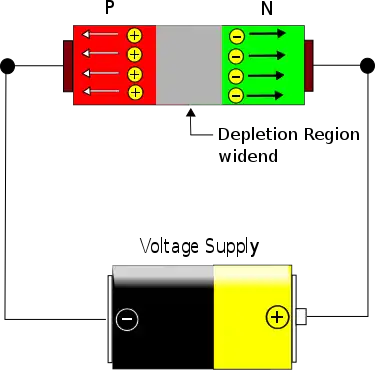 In reverse bias the P-type region is connected to negative voltage and N-type is connected to positive terminal as shown above. In this condition the holes in P-type gets filled by electrons from the battery / cell (in other words the holes get sucked out of the diode). The electrons in N-type material is sucked out of the diode by the positive terminal of the battery. So the diode gets depleted of charge. So initially the depletion layer widens (see image above) and it occupies the entire diode. The resistance offered by the diode is very huge. The current that flows in reverse bias is only due to minority charge which is in nano amperes in silicon and micro amperes in high power silicon and germanium diodes.