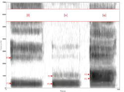A speech spectrogram (careful with terminology here!) graphs frequency vs time & the intensity (amplitude, loudness) is coded by darkness. This shows qualitatively how speech sounds unfold over time. Note that consonants are noisy (not loud! but broadband in frequency). Vowels, in contrast have prototyped horizontal bands of energy. These bands are called formants. Near consonants, one or more of the formant curves - this is a formant transition. Most vowels are steady-state; they do not change over time (monophthongs). Some vowel sounds are dipthongs - they transition from one spectrum to another over the course of the vowel.